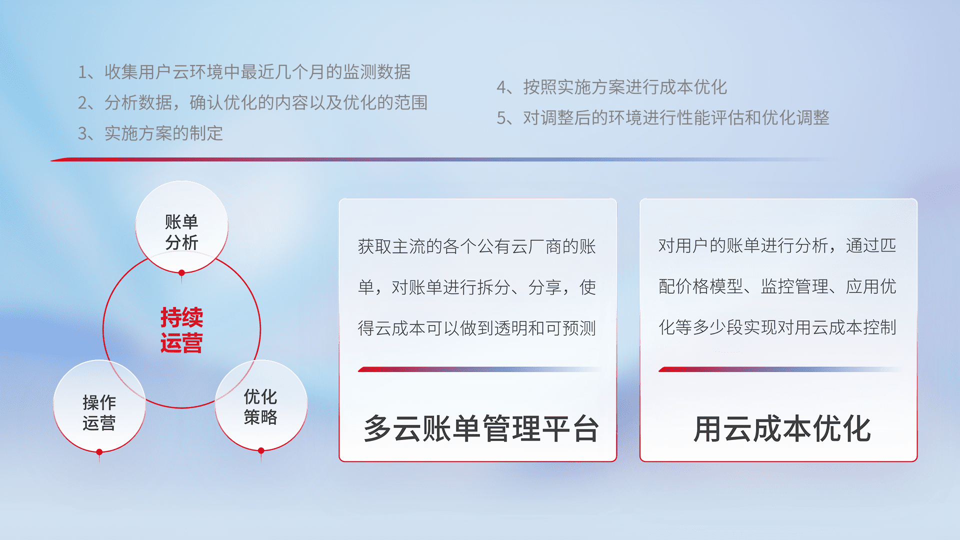 通过多云纳管,,以统一的资源数据模型把客户的云资源进行抽象和封装,,,,进而实现对多云资源的统一操作,,,保障云资源管理的可靠性、、稳定性与可用性。。。。量身定制化运维内容,,,,配置、、开发运维、、、、补丁管理、、、、备份、、监控、、、、认证和访问管理、、、、审计和日常巡检等,,保障在用云过程中的可靠度,,稳定度以及高可用率。。。