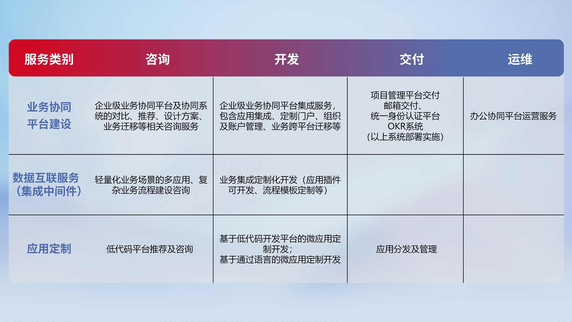 针对钉钉、、、企微、、、IDaas等平台级产品提供产品的规划、、方案、、、交付、、、、定制化开发等服务,,,实现如统一协同办公、、智能客户服务、、、混合会议管理、、智能数据查询、、、等业务场景,,,实现数字化转型。。。。